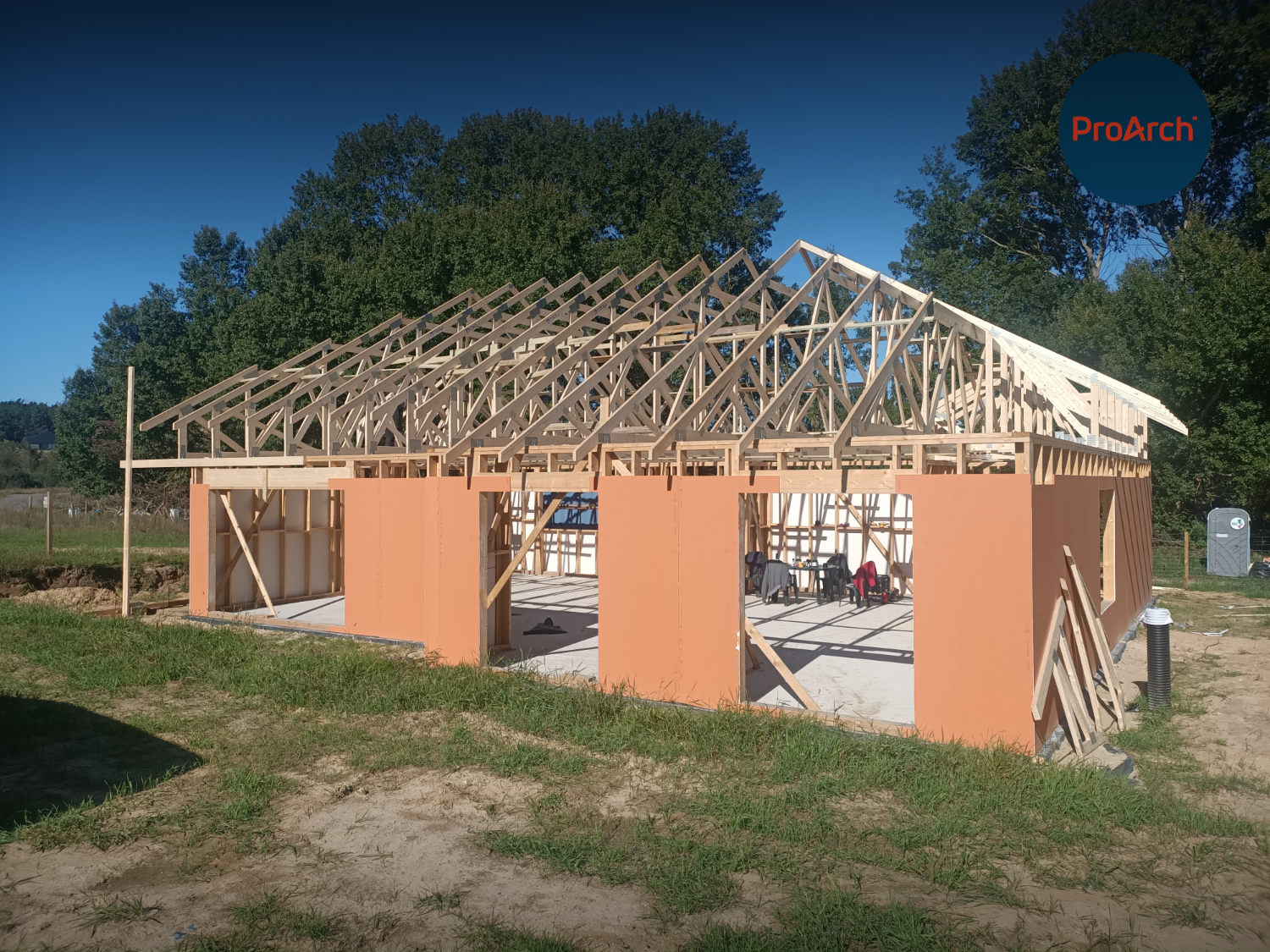 Budynek mieszkalny jednorodzinny o powierzchni ok. 250 m2 powstaje w okolicy Stargardu. Projektowanie i budowę rozpoczęliśmy w połowie 2022 roku. Prace na zewnątrz dobiegają do końca, do wykończenia pozostanie wnętrze.